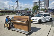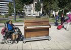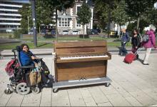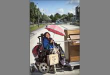 Nederland/Nijmegen : 04-09-2015 Rhea Elise Khoeblal , straatmuzikante in rolstoel, haar piano voortduwend op weg naar het centrum. mobiele piano, straatpianiste, buitenmuzikant, Foto: Bert Beelen/HH Foto: Bert Beelen
