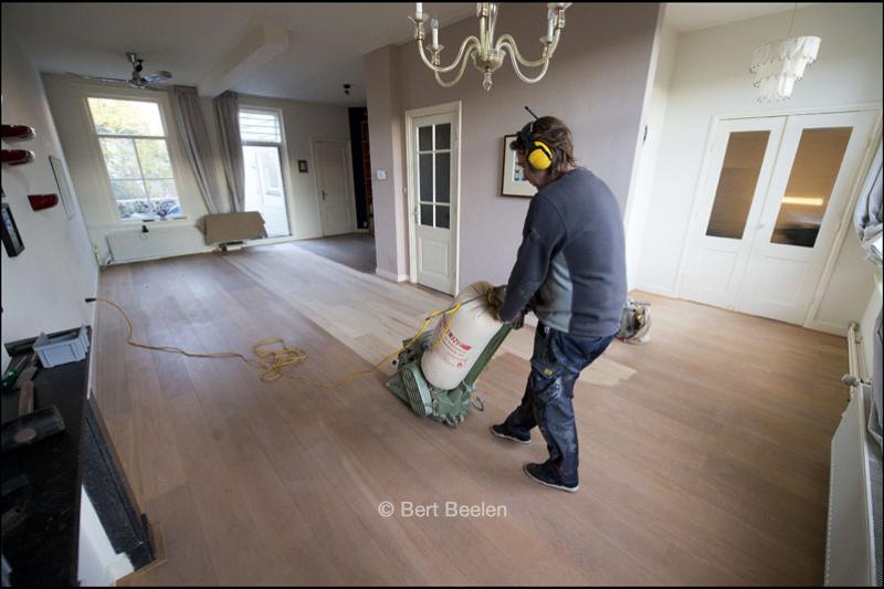 Een medewerker van een parketbedrijf schuurt de eikenhouten lamelplanken vloer met een schuurmachine. Hij heeft gehoorbescherming over zijn oren. In de ochtend schuren, 's middags met olie afwerken en de volgende ochtend kunnen de meubels er weer in.
