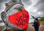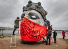 Nijmegen/Nederland: Het kunstwerk Het Gezicht van Nijmegen van Andreas Hetfeld op Veur Lent kreeg een enorme mondkap van kunstenares Pauline Wiersma met de tekst -Veni vidi vaccinatie- omgebonden. Andreas Hetfeld, de maker van het beeld, wil dat ze de rode mondkap van 6 bij 4 meter verwijdert. Haar actie heeft de kunstenares niet voorgelegd aan Hetfeld. Die kan het niet waarderen, dat een collega een kunstwerk kaapt. ,,En ik wil niet dat het beeld in verband wordt gebracht met corona. Ik zie het masker en de plek waar het staat als een plek van hoop en kracht die mensen opzoeken, juist om even aan corona te ontkomen. Een lichtpunt in deze tijd." Foto: Bert Beelen/Hollandse Hoogte/ANP