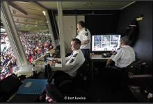 Nederland/Nijmegen: 10-05-2012 Meldkamer van politie in het stadion van NEC, re de monitoren van de extra camera's in de bossen. Gelderse derby NEC-Vitesse is voetbalwedstrijd in hoogste risicoklasse, daarom extra politie inzet ook van korpsen buiten de regio. Foto: Bert Beelen/HH