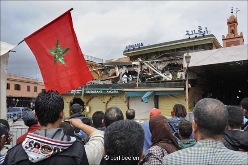 2 dagen na de bomaanslag in restaurant Argana op het plein Djamaa el Fna, ook wel genoemd Jemaa el Fna. 2 days after the bombing at the restaurant Argana Djamaa el Fna square, also called Jemaa el Fna. Toeschouwers staan achter dranghekken terwijl de recherche in witte pakken onderzoek doen.