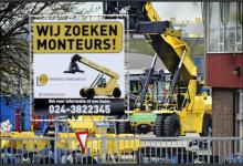 Nederland/Nijmegen: 01-04-2011. Heftruckproducent Nacco ( bedrijf dat voluit Nacco Materials Handling Group heet maar bekend staat als Hyster) in Nijmegen zoekt monteurs via een groot opvallend bord op hun bedrijfsterrein. Het bedrijf verwacht komende maanden wederom een stijging van de omzet met 30 procent. De groei komt uit de zogeheten BRIC-landen (Brazilië, Rusland, India en China). Nieuwe markten voor Nacco. Foto: Bert Beelen / HH