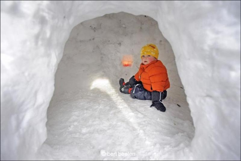 Nederland/Nijmegen: 21-12-2009 Kind zit in een net voltooide iglo van sneeuw. Een bouwploeg van 15 man heeft hier gisteren een aantal uren aan gewerkt. Foto: Bert Beelen/Hollandse Hoogte