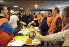 Nederland/Nijmegen: 07-10-2009 Ongeveer 500 medewerkers van bedrijven uit de regio Nijmegen waren woensdagmiddag bijeen in het Nijmeegse Gofferstadion. Ze protesteerden tegen de plannen van het kabinet om de AOW-leeftijd te verhogen naar 67 jaar. Foto: Bert Beelen/Hollandse Hoogte