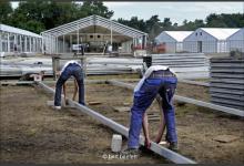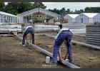 Nederland/Nijmegen: Opbouw van militair kamp Heumensoord waar tijdens de vierdaagse duizenden soldaten van over de hele wereld verblijven. Voor veel studenten is het opbouwen van dit kamp een mooie vakantiebaan. Frank (li) staand doet dit al voor 7e jaar als vakantiewerk en wacht nu op uitslag examen PABO. Hij geeft groentjes Sebas en Guus aanwijzingen als duimpje, teen, boord of jacob waarmee dikte van het opvulmateriaal wordt bedoeld, ze gebruiken geen waterpas, alles op het oog. Foto: Bert Beelen/Hollandse Hoogte