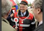Nederland/Molenhoek: 06-05-2009 Opening station Molenhoek, burgemeester Persoon geeft als perronchef met fluit en spiegelei het vertreksein. Foto: Bert Beelen/Hollandse Hoogte
