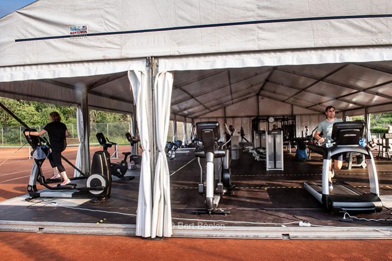 Molenhoek/Nederland: Lierdal Sportcenter Molenhoek. Fitness op 1,5 meter in grote tent op de tennisbaan. Tentenverhuur ligt bijna stil nu evenementen wegens corona niet doorgaan. Gedupeerde branches die elkaar helpen. Foto: Bert Beelen/HH