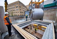 Nijmegen/Nederland: Plaatsen/ installeren van een MR-Linac, het neusje van de zalm voor het onderzoeken en behandelen van tumoren in het RadboudUMC. De MR-Linac kan tegelijkertijd een mri-scan maken én bestralen. Foto: Bert Beelen/HH