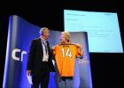Nederland/Nijmegen: Johan Cruijff, Erica Terpstra en Tom van 't Hek tijdens uitreiking Leadership Award. Het Johan Cruijff college stimuleert de maatschappelijke ontwikkeling van jonge sporters. Foto: Bert Beelen/Hollandse Hoogte