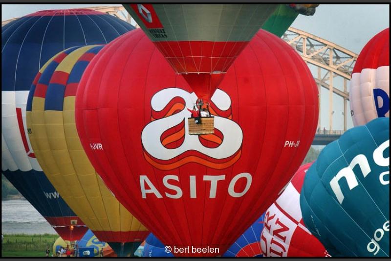 Nederland,Nijmegen: 20-07-2004. Zomerfeesten, vierdaagsefeesten, luchtballonnen boven de Waal en de skyline van Nijmegen. Foto: Bert Beelen/Hollandse Hoogte.