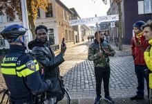 Anti-zwarte piet betogers gaan er snel na het uitrollen vandoor.