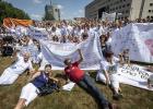 actie voeren; spandoeken; onvrede; uiten; gezondheidszorg; verpleging; zorgsector