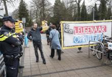 Nederland/Nijmegen: 11-03-2018 VVD leider / premier Mark Rutte was een uurtje bakkie doen in Nijmegen om een praatje te maken met Nijmegenaren en om de plaatselijke VVD te steunen voor de lokale gemeenteraadsverkiezingen. Een vijftal mannen van Nijmegen Rechtsaf kwam demonstreren. Foto: Bert Beelen/HH